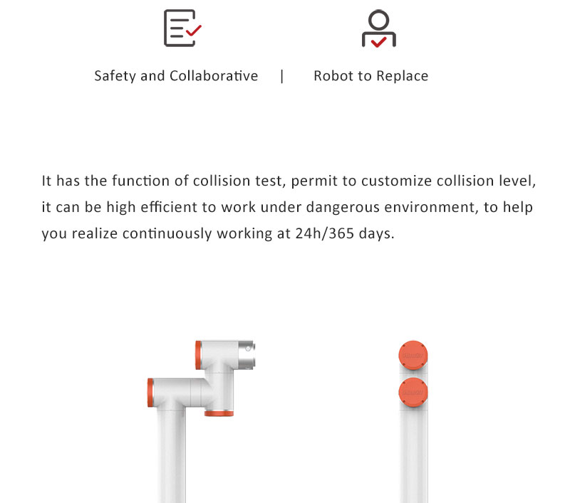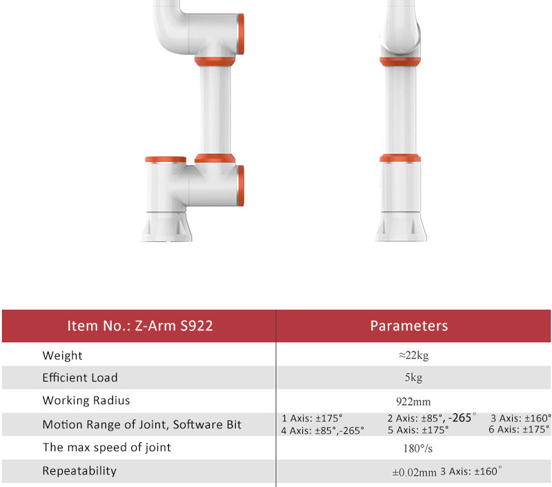 Por seguridad, HITBOT Z-Arm S922 es un brazo robótico cooperativo hombre-máquina amigable, puede ser fácil de trabajar con los trabajadores, el operador puede moverse fácilmente en los alrededores sin preocuparse por influir en su trabajo. El HITBOT Z-Arm se detendría automáticamente al tocar a un ser humano, lo que puede crear un entorno de trabajo completamente automático y completamente seguro..